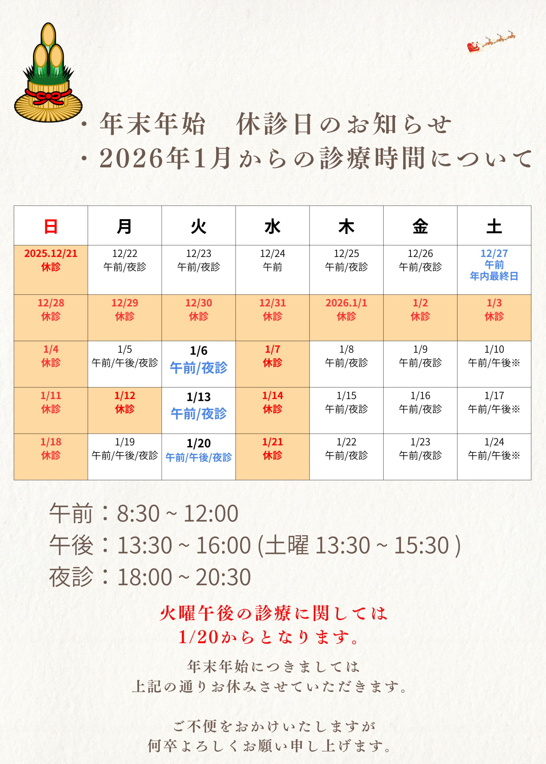 年末年始休診日と2026年1月からの診療時間のおしらせ